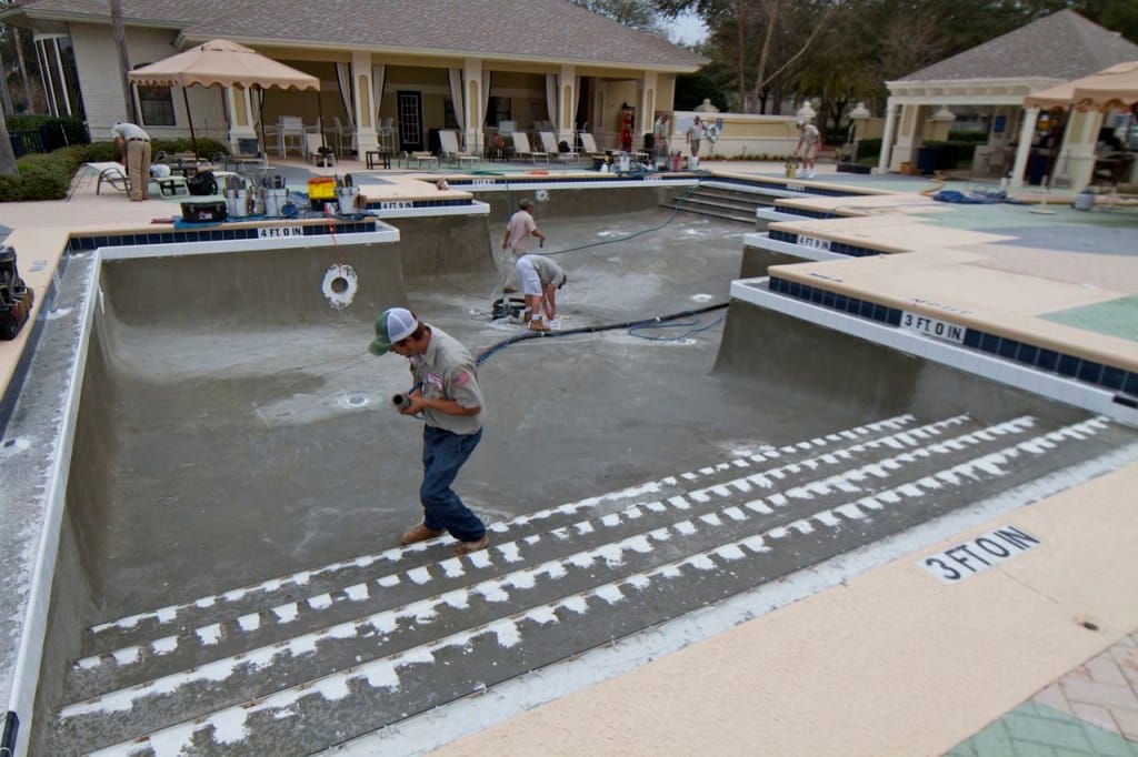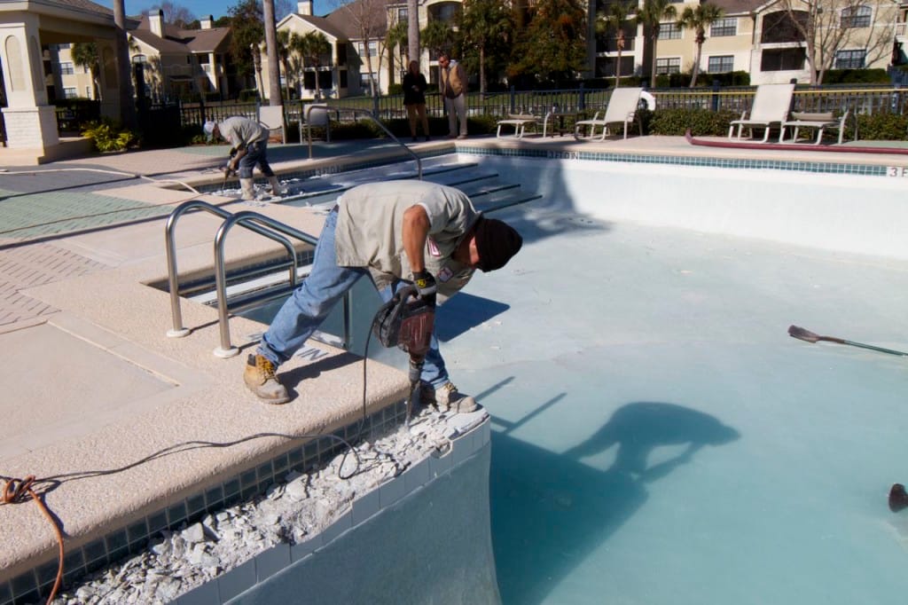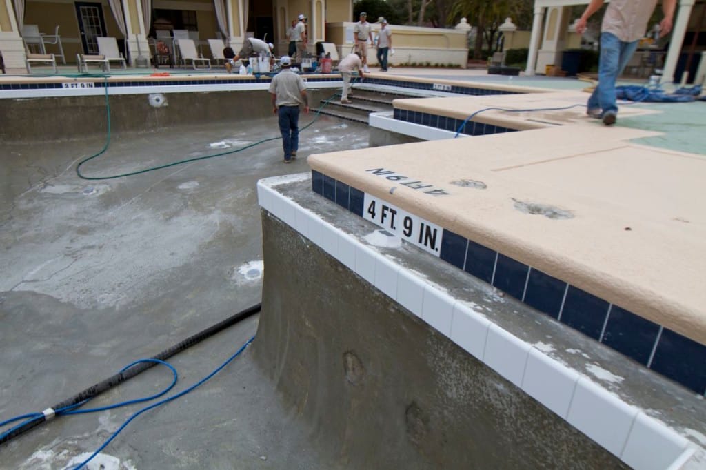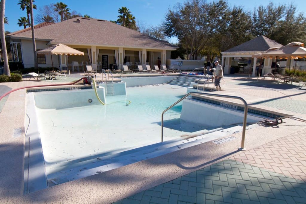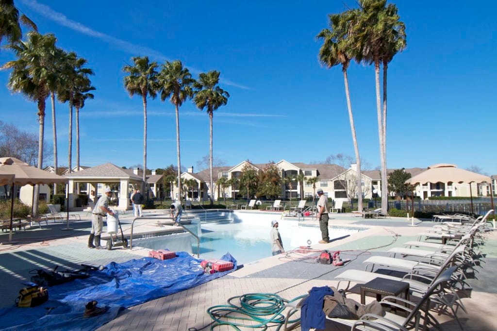 Since 1992, we’ve remodeled thousands of pools, many of which are commercial jobs. Whether the remodel is for the city, a resort, neighborhood, or condo/apartment complex our number one goal is to make the client happy. We don’t leave the job until we accomplish this all important goal. We were recently hired by Crown Pools to remodel the pool and spa at Belleza Condominiums, an upscale development in Ponte Vedra Beach, FL. The manager of the complex wanted to refinish the interior, update the tiles, and add new internal light fixtures. She requested a navy blue tile, which apparently was in very limited supply nationwide. We were able to locate the tile through a distributor in Arizona. Being a commercial pool, the surface of the tile would need to be baked with a non skid finish. We had the tiles shipped to West Palm Beach to have this process done and within three days we had the tile. During this time, our remodel crew went to work prepping the pool and spa for the tiles and new plaster. The pool was drained and the guys chipped out the old gutters to make room for the new plaster. Within a week the new tiles were installed and the pool/spa was ready for plaster. The spa was finished with pebble and the pool would get Krystalkrete. Two different finishes meant we’d have to use two pump rigs.