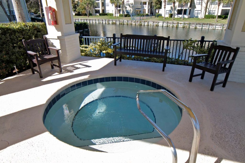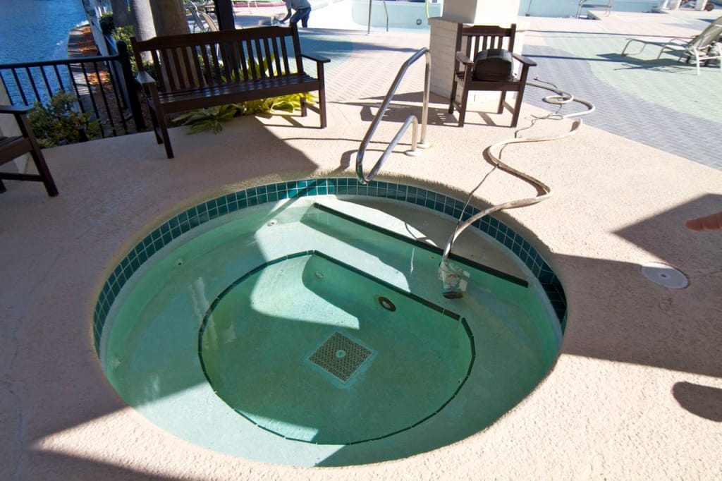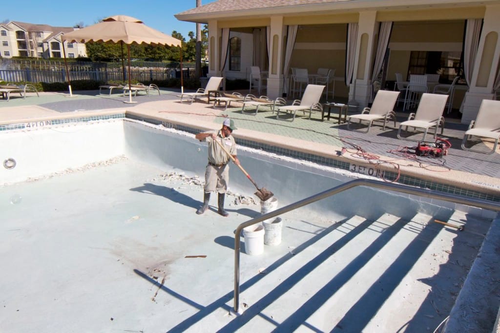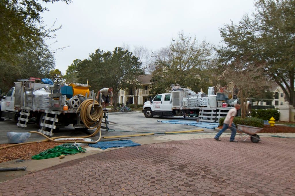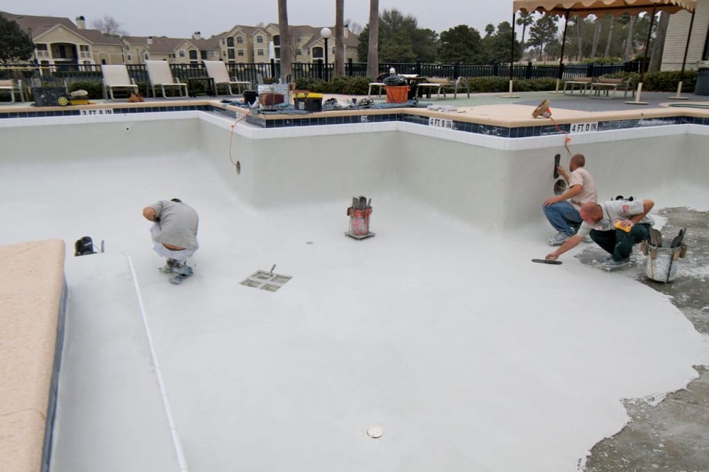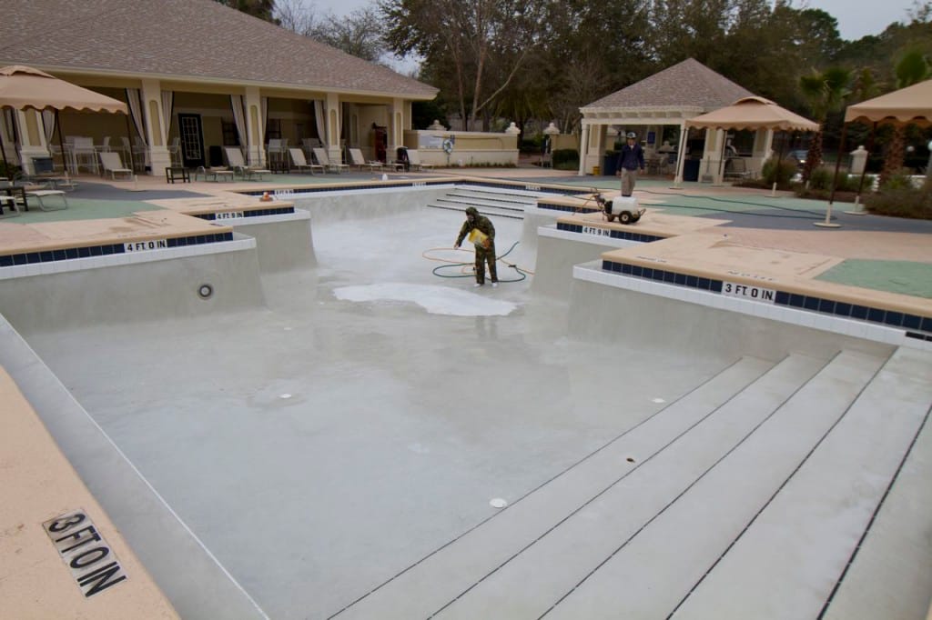 Since 1992, we’ve remodeled thousands of pools, many of which are commercial jobs. Whether the remodel is for the city, a resort, neighborhood, or condo/apartment complex our number one goal is to make the client happy. We don’t leave the job until we accomplish this all important goal. We were recently hired by Crown Pools to remodel the pool and spa at Belleza Condominiums, an upscale development in Ponte Vedra Beach, FL. The manager of the complex wanted to refinish the interior, update the tiles, and add new internal light fixtures. She requested a navy blue tile, which apparently was in very limited supply nationwide. We were able to locate the tile through a distributor in Arizona. Being a commercial pool, the surface of the tile would need to be baked with a non skid finish. We had the tiles shipped to West Palm Beach to have this process done and within three days we had the tile. During this time, our remodel crew went to work prepping the pool and spa for the tiles and new plaster. The pool was drained and the guys chipped out the old gutters to make room for the new plaster. Within a week the new tiles were installed and the pool/spa was ready for plaster. The spa was finished with pebble and the pool would get Krystalkrete. Two different finishes meant we’d have to use two pump rigs.
