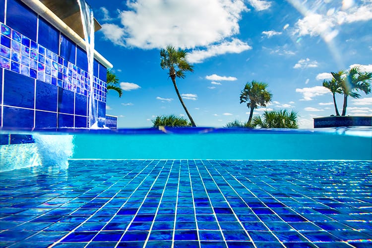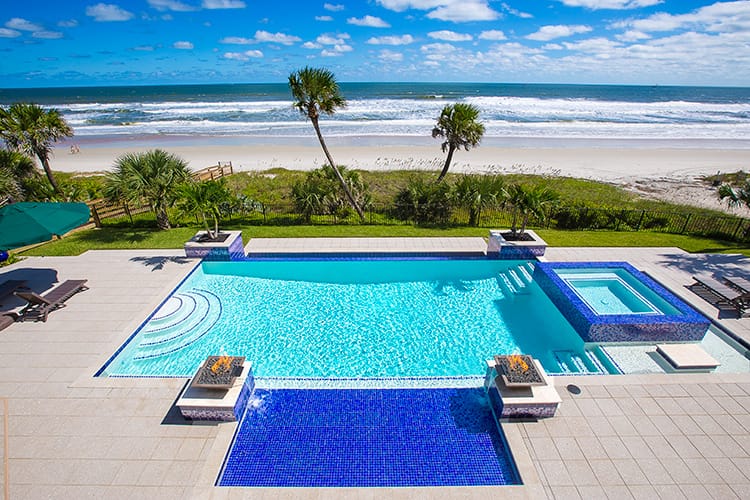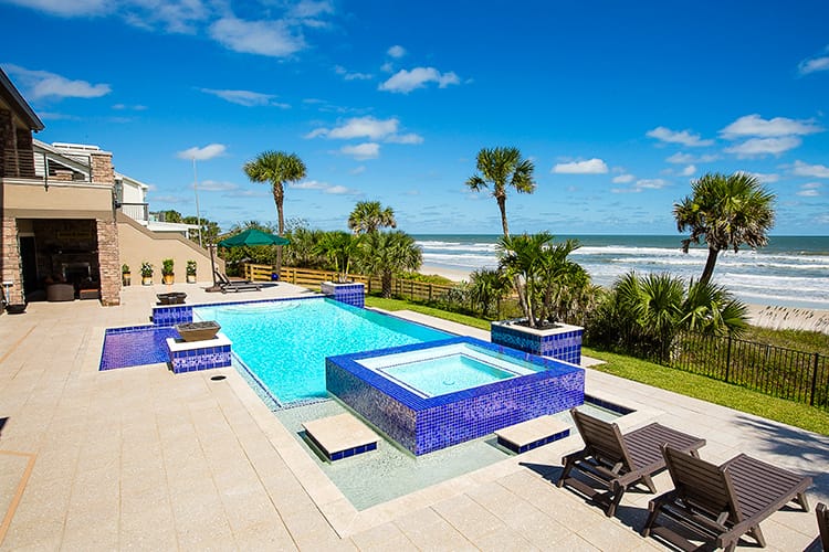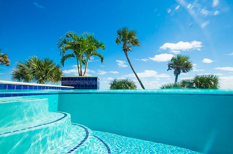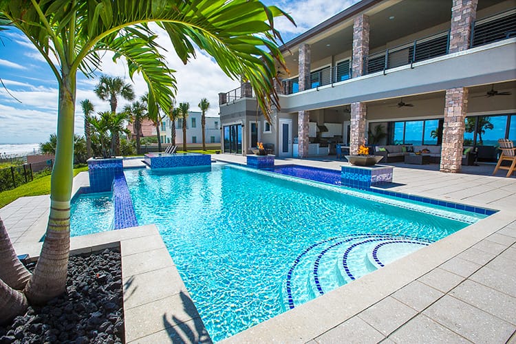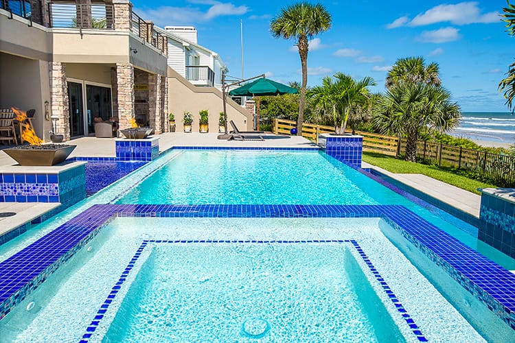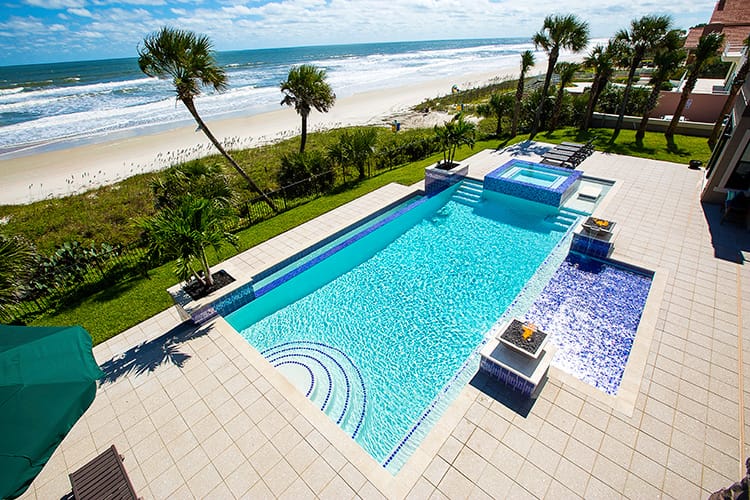 We love working with good people who care about the work they do. Kim and Ray Raszl of Raszl Custom Pools and Spas in Ormond Beach are prime examples of our ideal customer. The Raszls were previously subcontracting another company to plaster their pools, but had one unresolved issue too many, causing them to look for another vendor. Kim contacted us, and we assured her that we would never leave an issue unresolved. We recently plastered the pool below with Cove Blue Ice, a pebble and glass bead blend. The resulting water color is the perfect compliment to their impeccable design. Kim is submitting this pool for a Florida Swimming Pool Association design award.