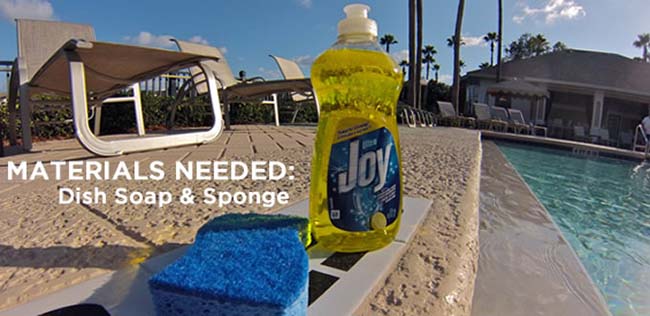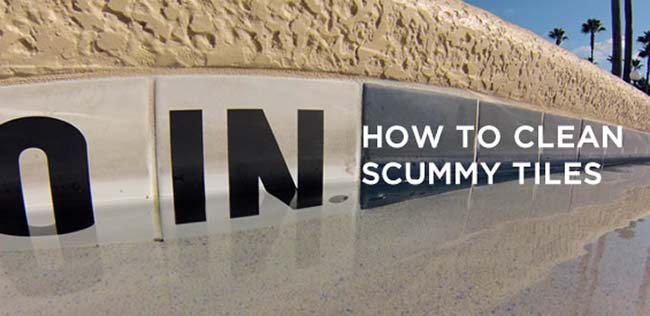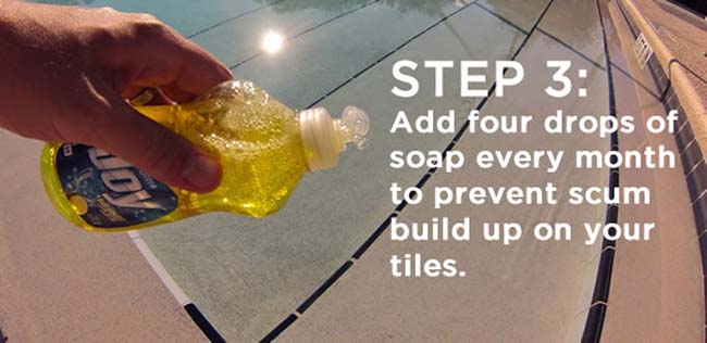 Over the years we’ve tried everything imaginable to efficiently clean the tiles. We discovered that Joy dish soap works the best (Dawn & generic dish soaps will also work). There is a degreasing agent in the soap and when you put a small amount on a sponge you can quickly clean the surface of the tiles. After your tile is clean (or already in good shape and not noticeably scummy) add four drops of Joy directly into your pool every month (15’ X 30’ std pool). This will keep your tiles from collecting the scum and it won’t effect your pool’s water chemistry. It will also extend the life of your pool filter if you use a cartridge filtering system.