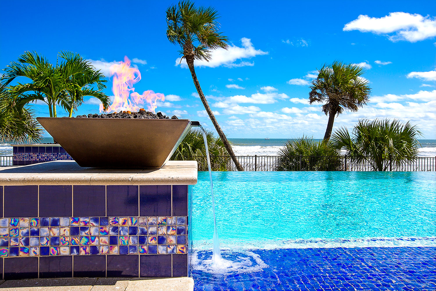 We love working with good people who care about the work they do. Kim and Ray Raszl of Raszl Custom Pools and Spas in Ormond Beach are prime examples of our ideal customer. The Raszls were previously subcontracting another company to plaster their pools, but had one unresolved issue too many, causing them to look for another vendor. Kim contacted us, and we assured her that we would never leave an issue unresolved. We recently plastered the pool below with Cove Blue Ice, a pebble and glass bead blend. The resulting water color is the perfect compliment to their impeccable design. Kim is submitting this pool for a Florida Swimming Pool Association design award.